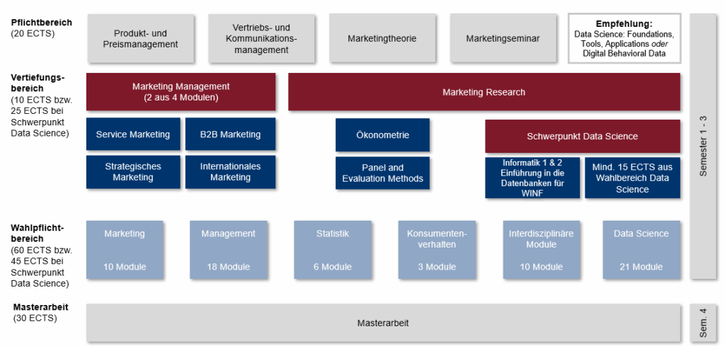 - Methodische Module aus dem Bereich Statistik wie z. B. Advanced Marketing Analytics oder Microeconometrics and Machine Learning greifen aktuelle Entwicklungen in der Marktforschung auf.